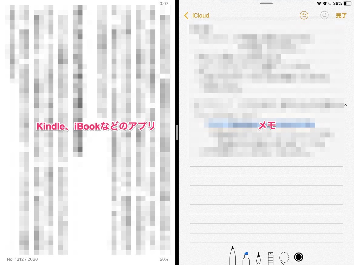 今まで電子版の本を読んでもその辺のノートに書いたりDropbox Paperに書いたり色々していたが、ApplePencilを買ったことでデフォルトのメモアプリに統一した。(ちなみにGoodNoteも使ってみたが、MacとiPhoneとiPadで楽に同期を取ることを優先したので使ってない。)どうせ一度に読める量はたかが知れてるので、下のキャプチャのように半分は本、半分はメモにしてる。キーボードで打つよりも自分の手で書くほうが自分は記憶に残るので今の所このスタイルが合ってるぽい